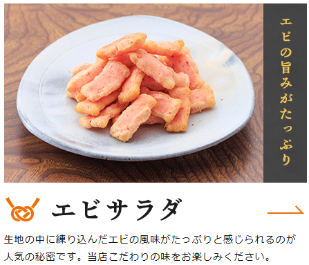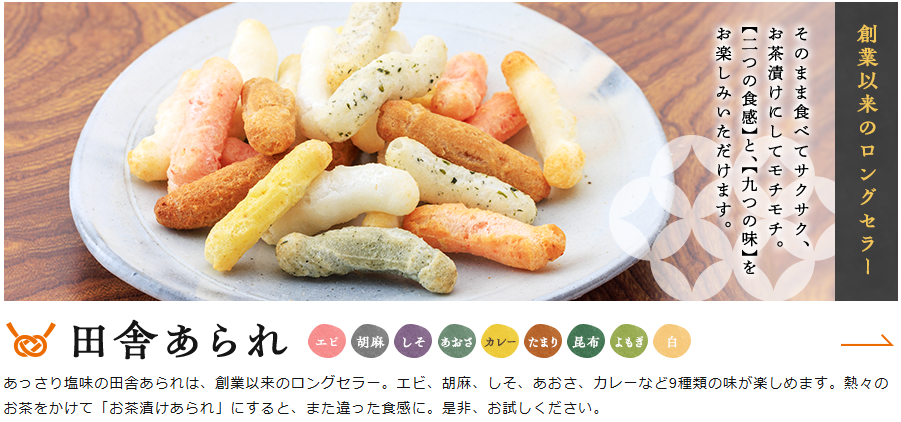 当店では、創業以来のロングセラー商品である「田舎あられ」をはじめ、エビサラダ、黒こしょう、青のりサラダ、カレー味など、様々な味わいのあられを販売しております。特に「田舎あられ」は、あっさりとした塩味が特徴で、エビ、胡麻、しそ、あおさ、カレーなど9種類の味が楽しめる人気商品です。熱々のお茶をかけて「お茶漬けあられ」としても美味しくお召し上がりいただけます。