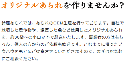 さらに、企業様や団体様向けのOEM生産においても、小ロットからの対応が可能という強みがあります。約30袋という比較的少量からの製造に対応できるため、特産品や記念品、販促品などとして、オリジナルあられの製造を検討されている企業様や団体様にとって、大変利便性の高いサービスを提供しています。
